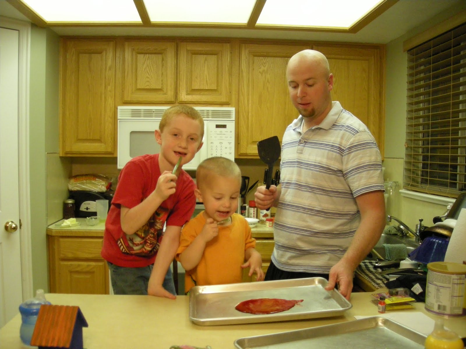 Our kids are at such a fun age right now. Matt is a great brother and friend and still likes to play with his little brothers (which I know won't always be the case), Chase mentions his birthday and Christmas multiple times a day and is so excited about them, and Kamron is walking all over wanting to be involved in whatever his brothers are doing. So this year, we decided to get a little more organized for Christmas and to do a lot of fun things with the kids. Tim used to make candy canes at a friend's house when he was younger, so he wanted to try it out with the kids. We got Strawberry, butterscotch, and watermelon flavoring.